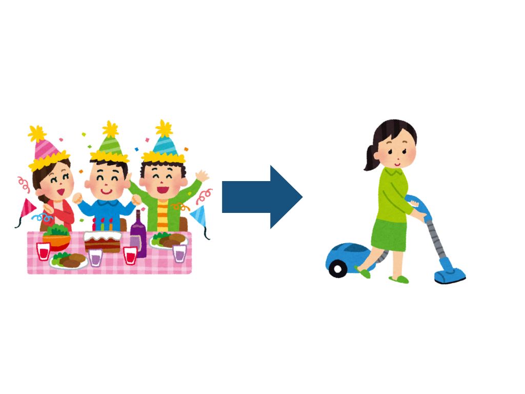 T:授業です+質問します、会議です+資料を作ってください、ミーティングです+出かけます、パーティーです+部屋を掃除します、運動会です+温泉に入ります、結婚式です+旅行に行きます