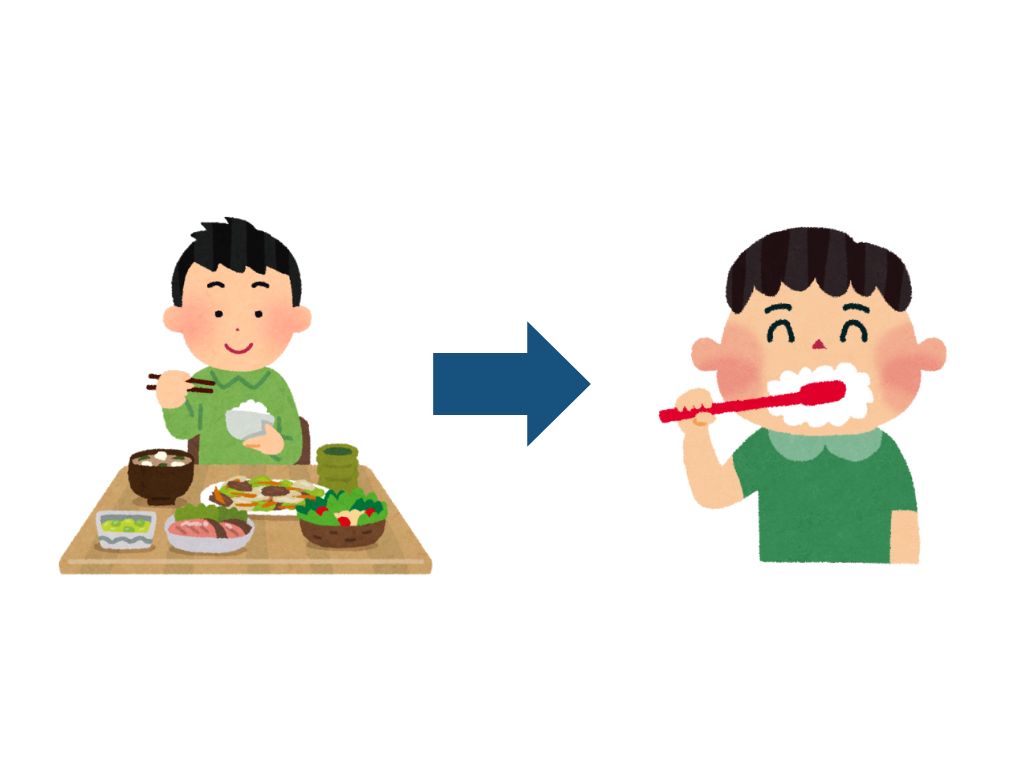 T:朝ごはんを食べます+歯を磨きます、シャワーを浴びます+ビールを飲みます、走ります+勉強します、電車を降りました+忘れ物に気がつきました