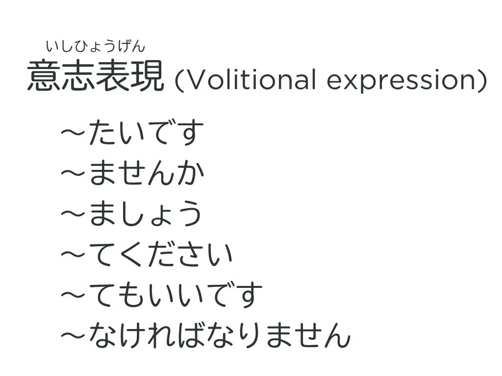 T:他にも、「〜たいです」「〜ませんか」「〜ましょう」「〜てください」「〜てもいいですか」「〜なければなりません」は意志表現です。
