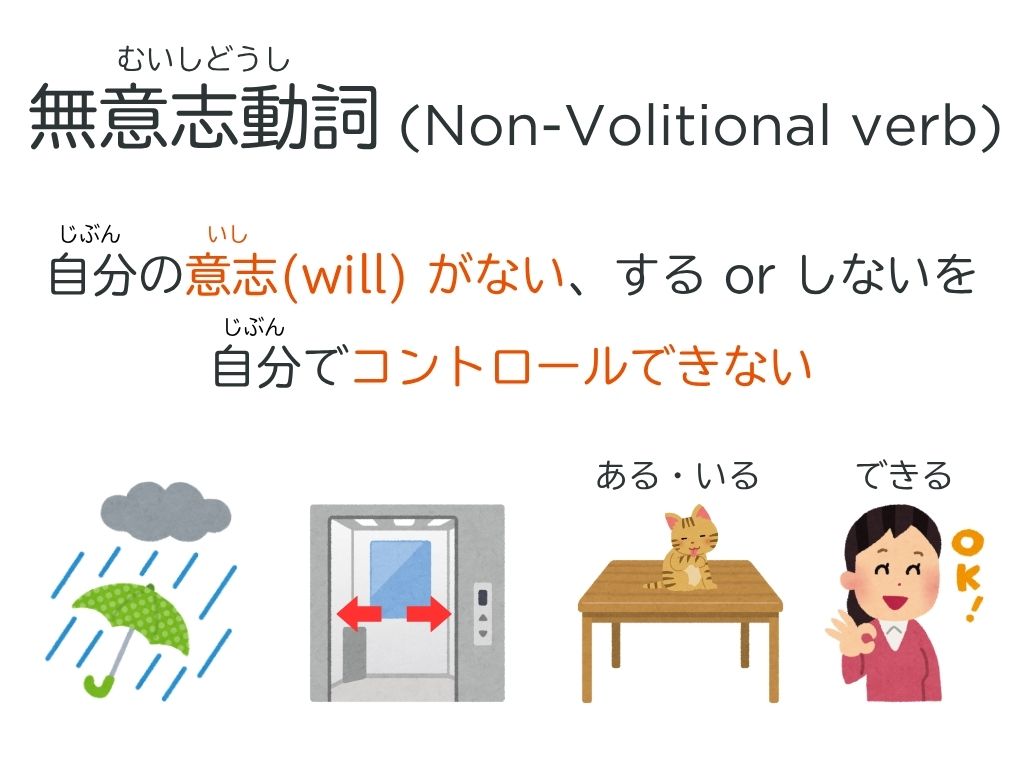 例えば、雨が降ります、ドアが開きます、テーブルがあります、猫がいます、などです。それからできますなどの可能形も無意志です。