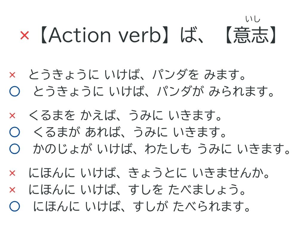 条件形の文は「【Action verb】ば【意志】」の組み合わせでは使えません。