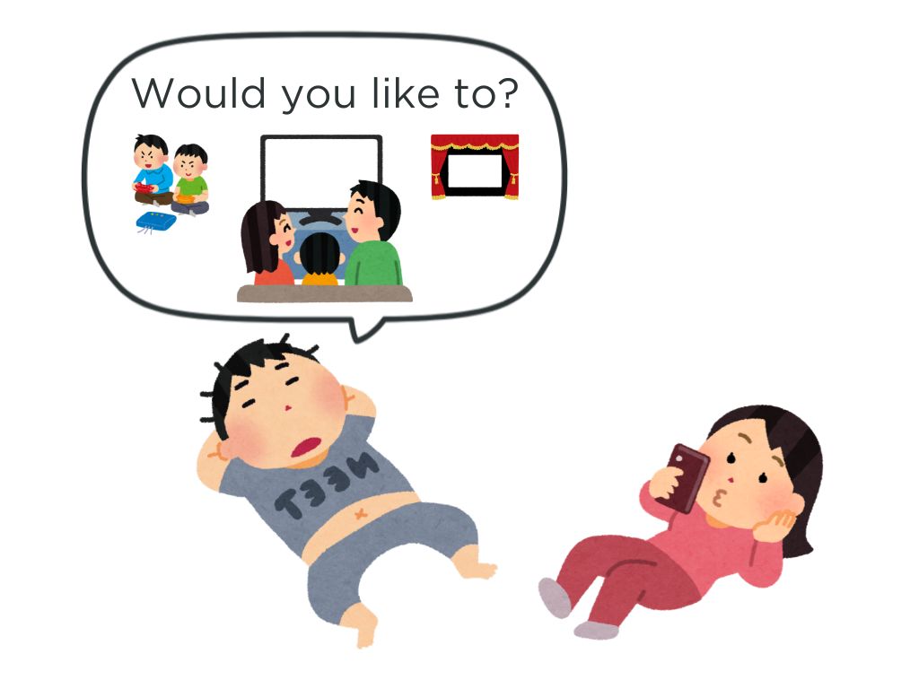 T:暇ですね。何かしたいです。ゲームをします。映画を見ますもいいですが、例えばテレビを見ませんか?