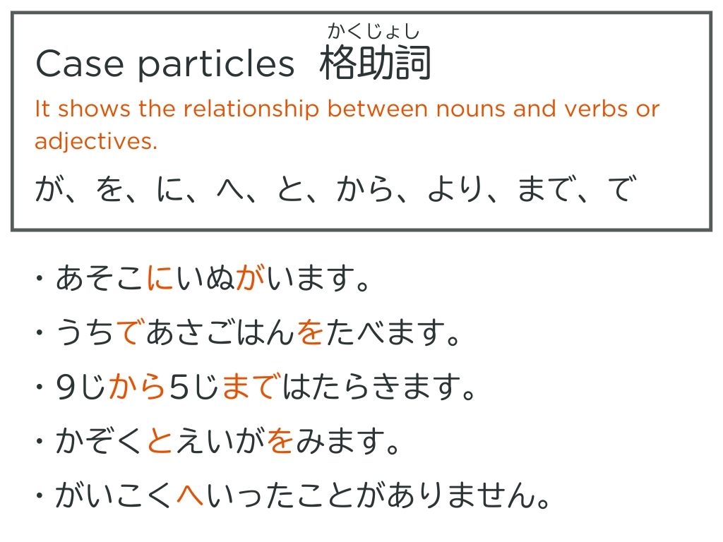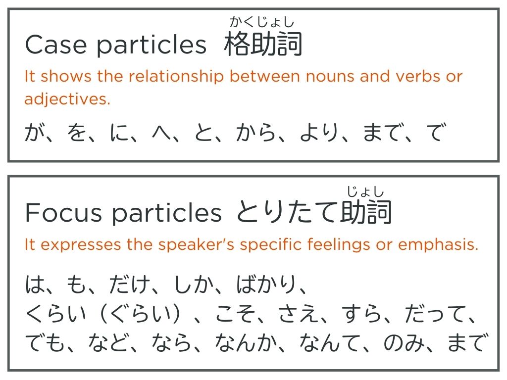 T:Particleは日本語で助詞です。助詞は「格助詞(Case particles)」と「とりたて助詞(Focus particles)」の二つのグループがあります。