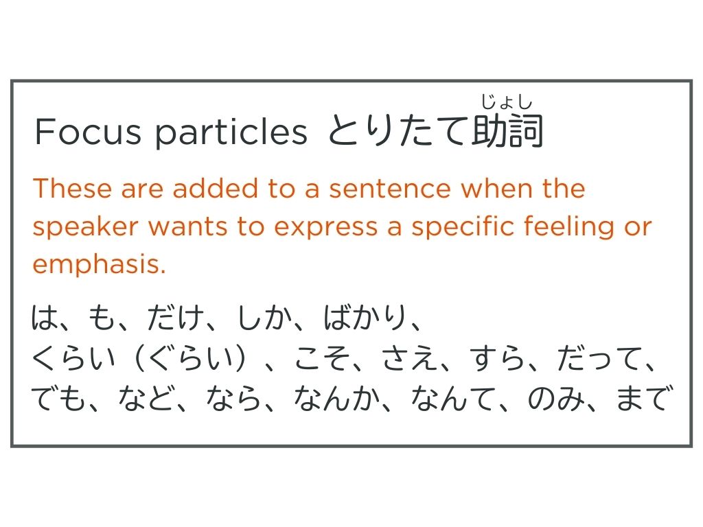 T:とりたて助詞は話している人のフィーリングや特に言いたいことがあります。