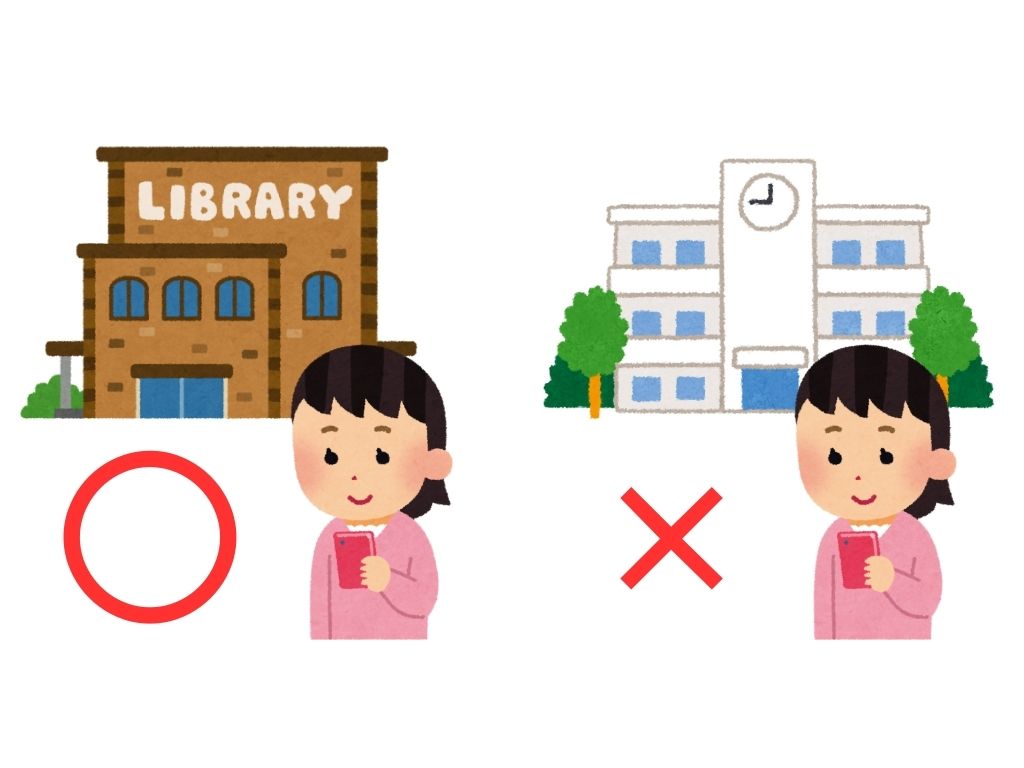 図書館では携帯が使えます。学校では使えません。