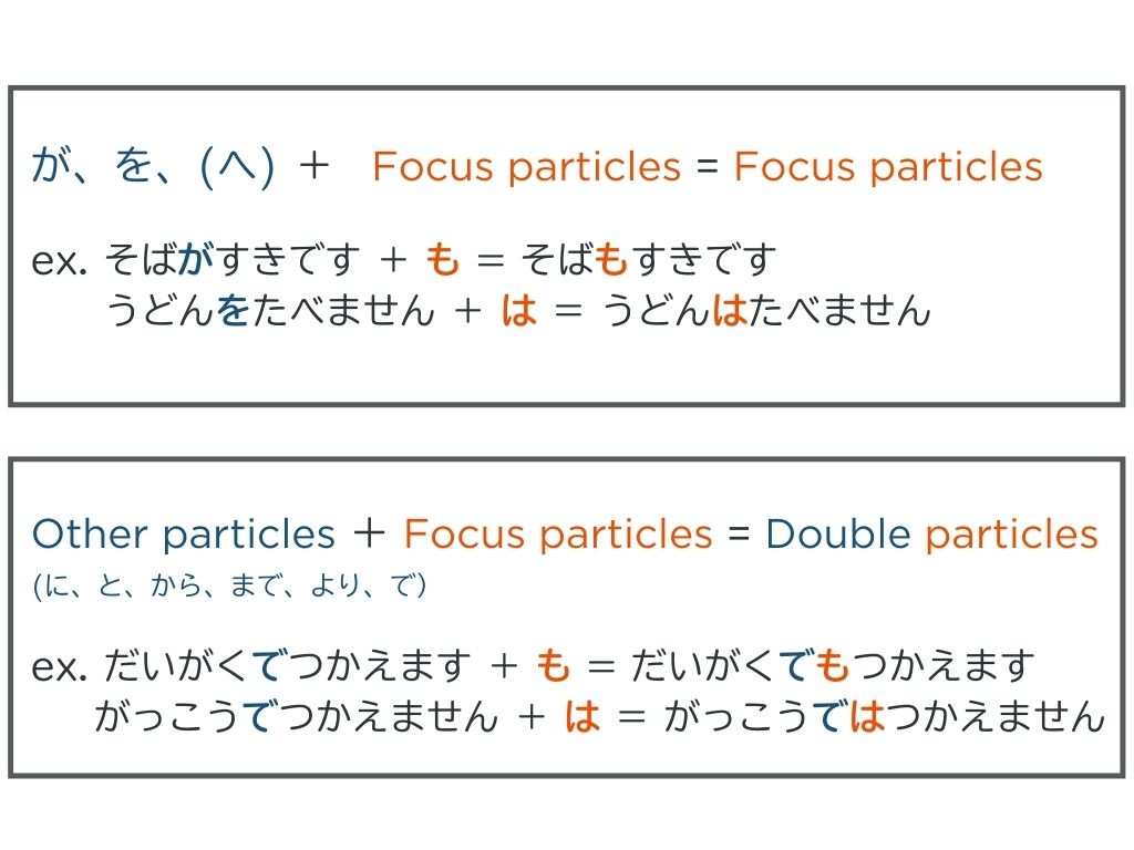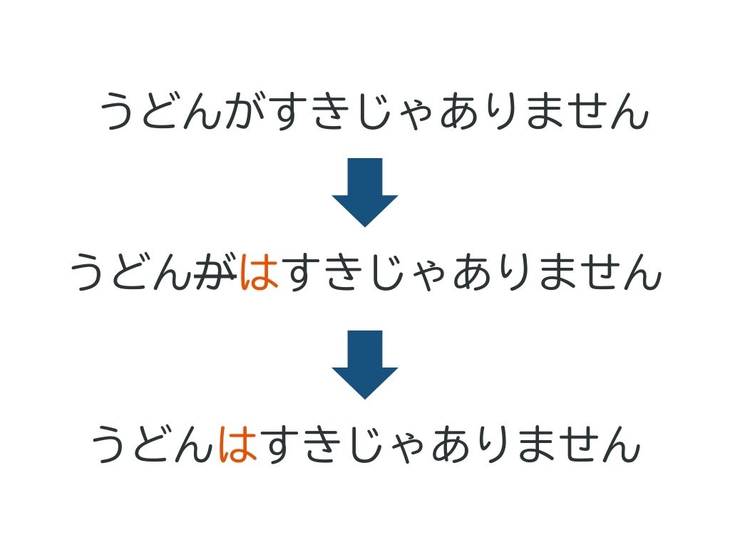 例えば、「そばが好きです」に「も」がプラスすると、「そばも好きです」。「うどんを食べません」に「は」をプラスすると、「うどんは食べません」になります。