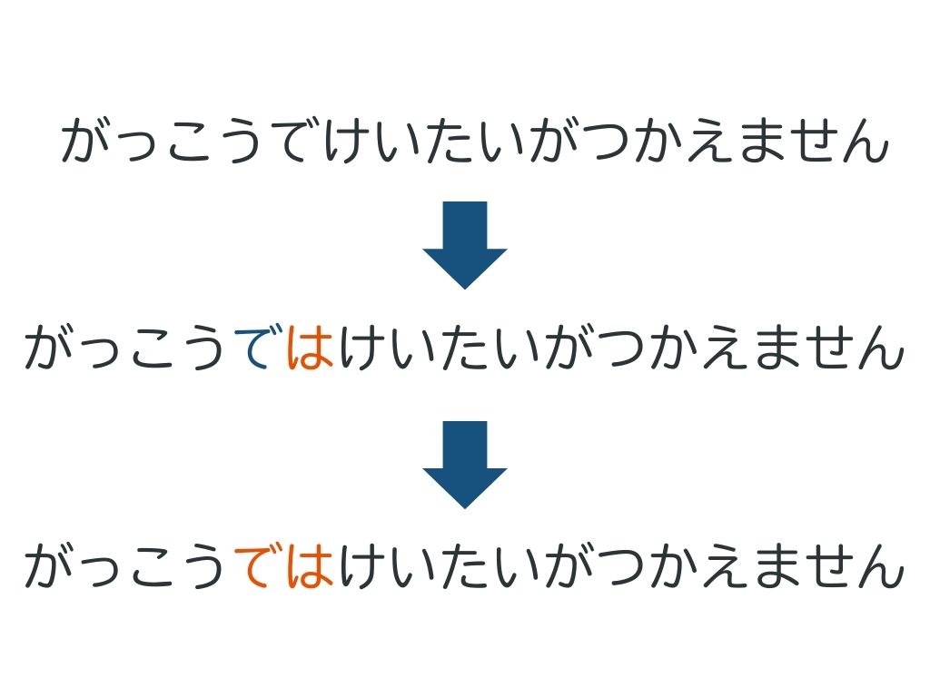 「大学で使えます」に「も」をプラスすると「大学でも使えます」、「学校で使えません」に「は」をプラスすると、「学校では使えません」になります。
