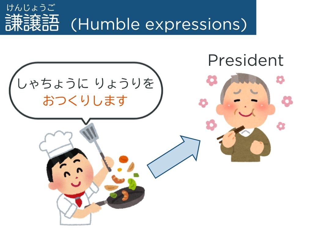 T:謙譲語を使うシチュエーションは尊敬語と同じです。自分より偉い人、お客さんと話すとき、あまり知らない人と話すとき、そして、会議、スピーチなど、フォーマルなシチュエーションで使います。