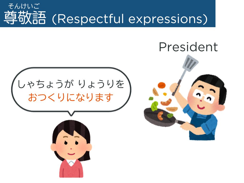 49課では尊敬語を勉強しました。「尊敬語」は自分より偉い人がすることについて話します。