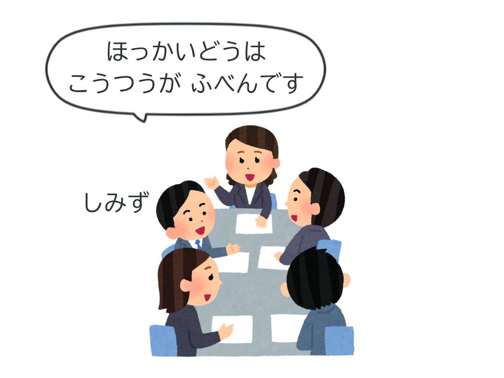 清水さんは会議で北海道は交通が不便だと言いました。
