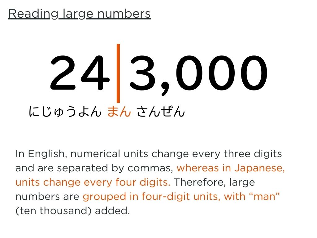 英語はthousand(1,000)→million(1,000,000)→billion(1,000,000,000)と3桁おきにコンマがついて単位が変わりますが、日本語では一、十、百に続く単位は1万(10,000)→1億(100,000,000)→1兆(1,000,000,000,000)と、4桁おきに変わります。