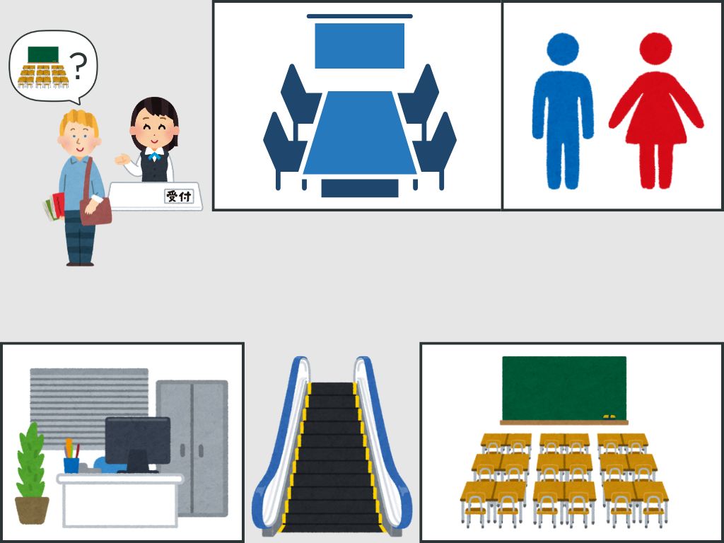 T:すみません。教室はどこですか?