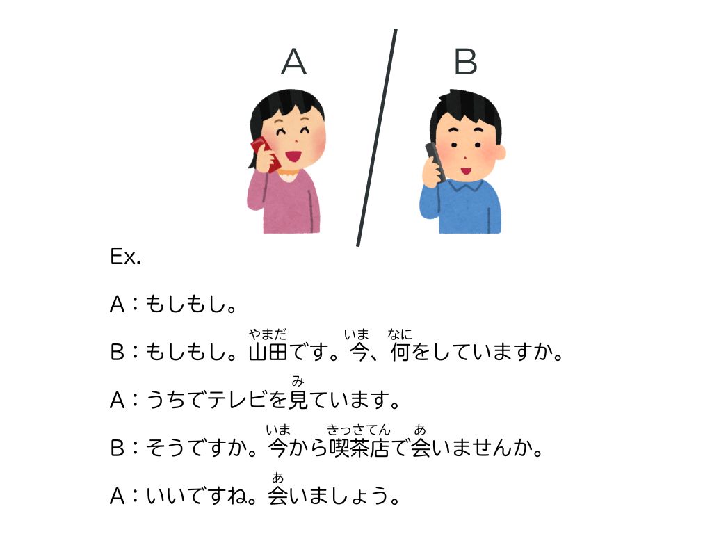 →①のAが今していること、Bが誘うことに言葉を変えてオリジナル会話を作らせる。次に②も同様に会話を作らせる。