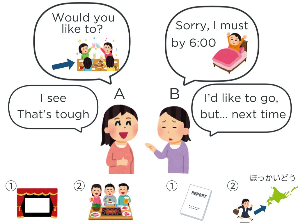 →A、Bの行動を①に変えて、会話を作らせる。同様に②に変えて、会話を作らせる。