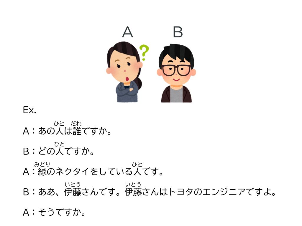 →クラスの実際の人または写真で人を見せ、オリジナル会話を作らせる。