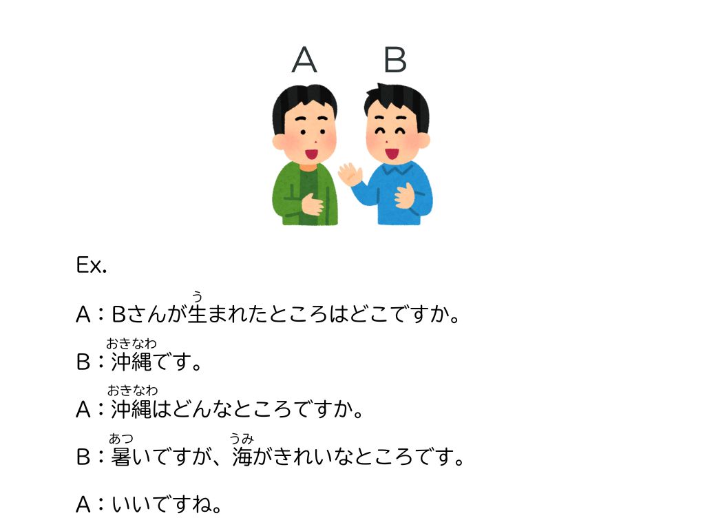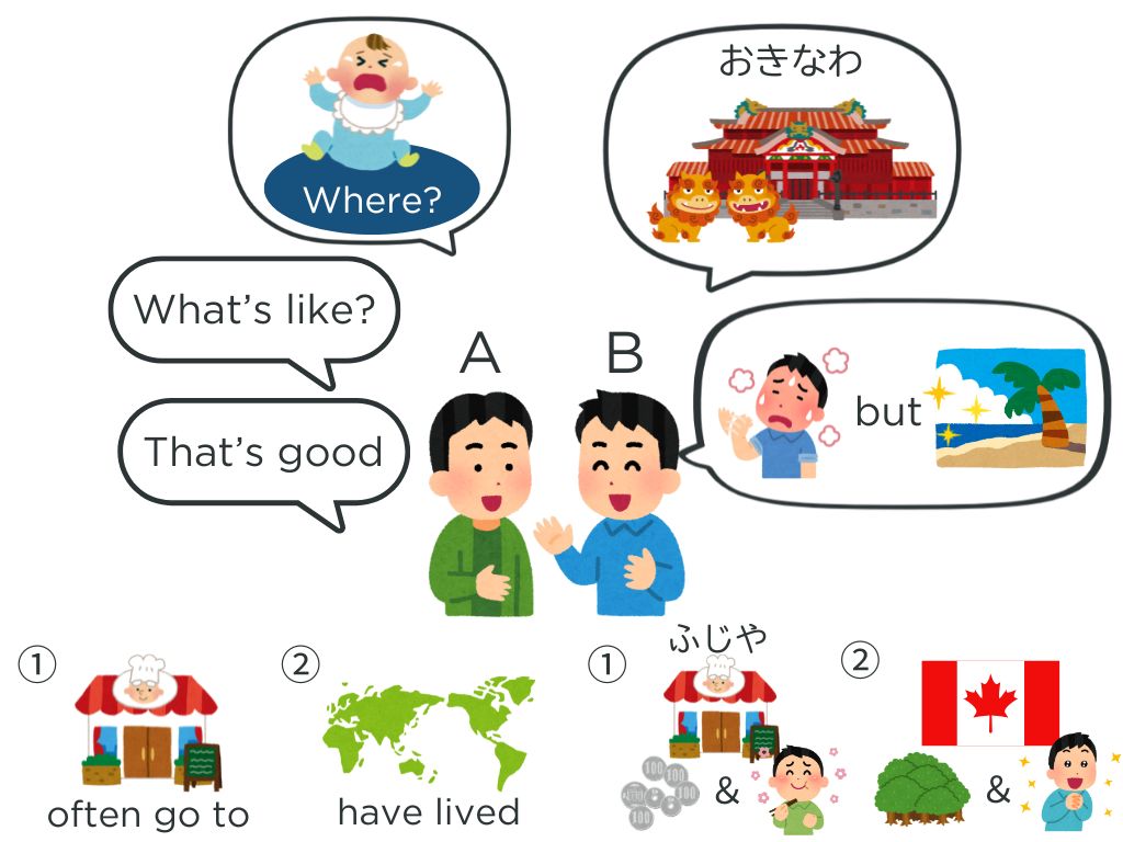 →Aの質問、Bの答えを①に変えて会話を作らせる。同様に②に変えて、会話を作らせる。