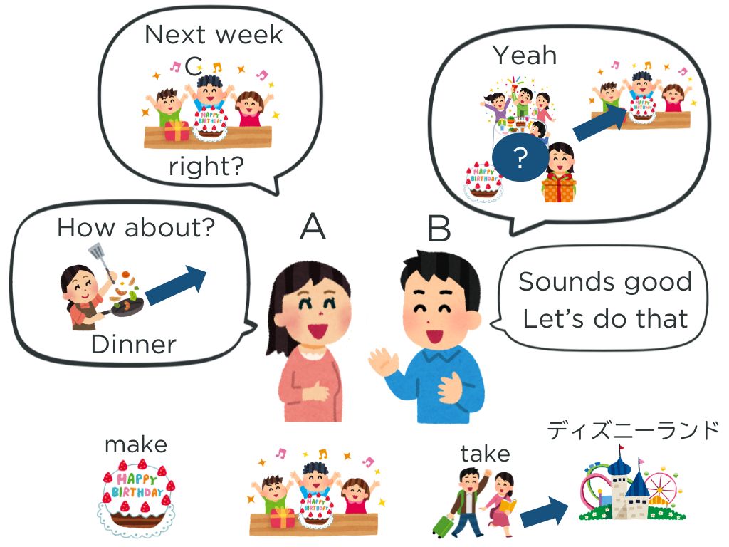 →自由に言葉を変えてオリジナル会話を作らせる。