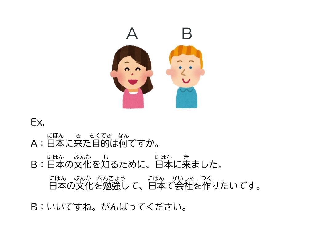 →下の行動、目的に言葉を変えて会話を作らせる。