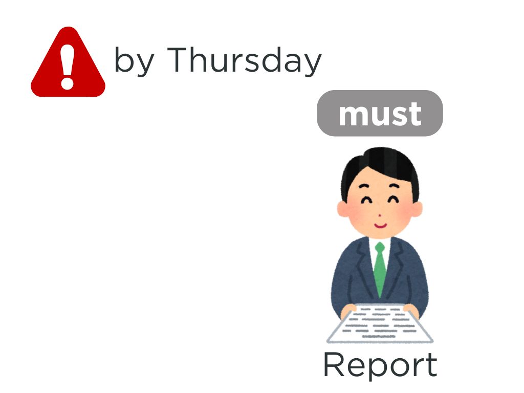 金曜日です+銀行に行きます、来月です+レポートを出します、7時です+起きます、9時です+空港に行きます、1月です+友達にお金を返します
