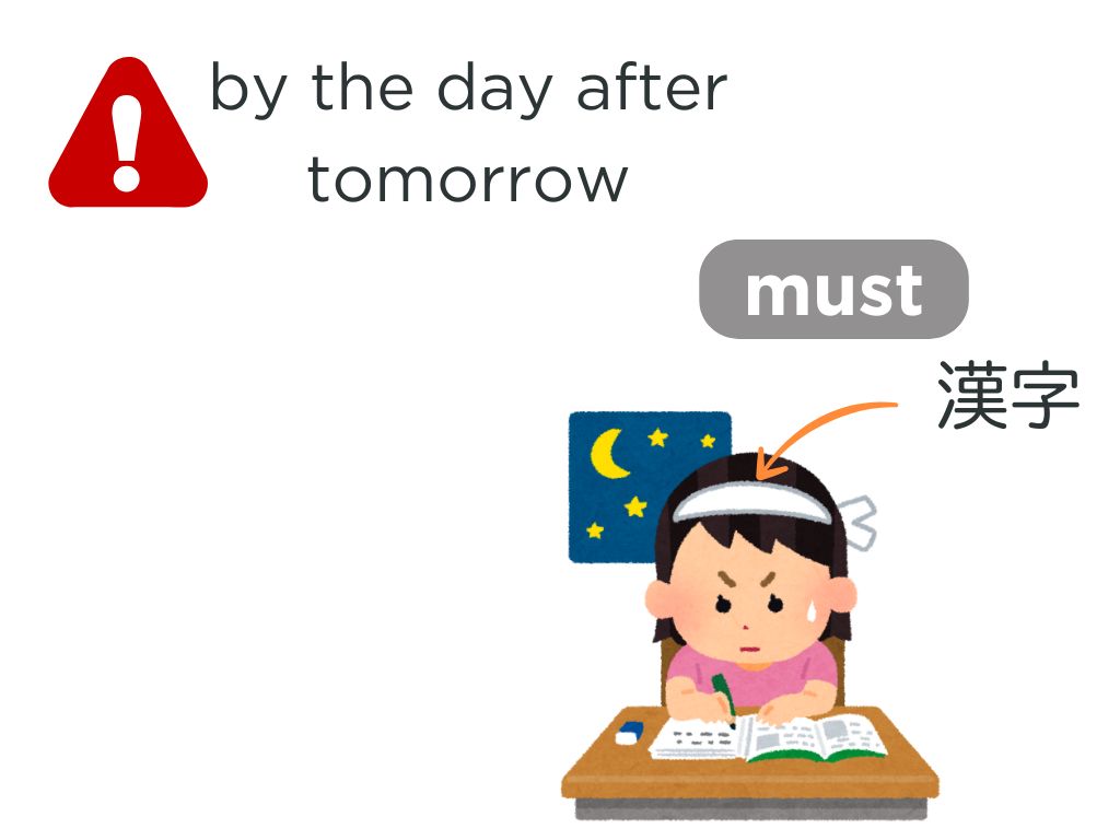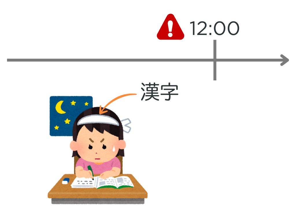 T:「12時までに漢字を覚えます」は12時はdeadlineです。10時に終わります。