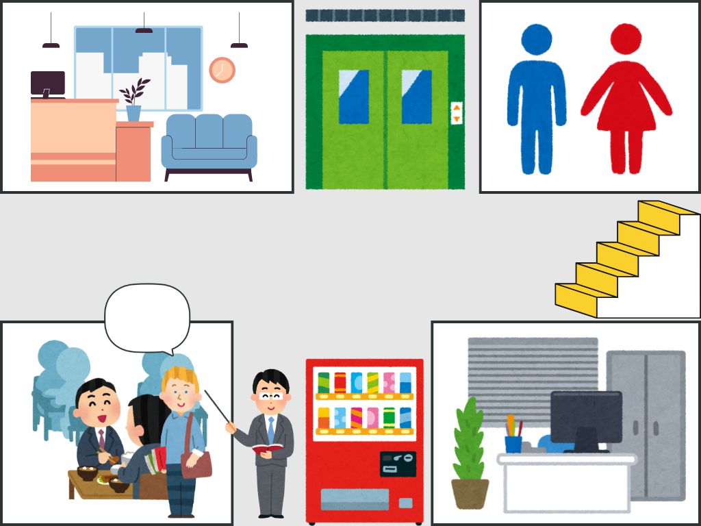 T:受付、トイレ、食堂、会議室、階段、エレベーター