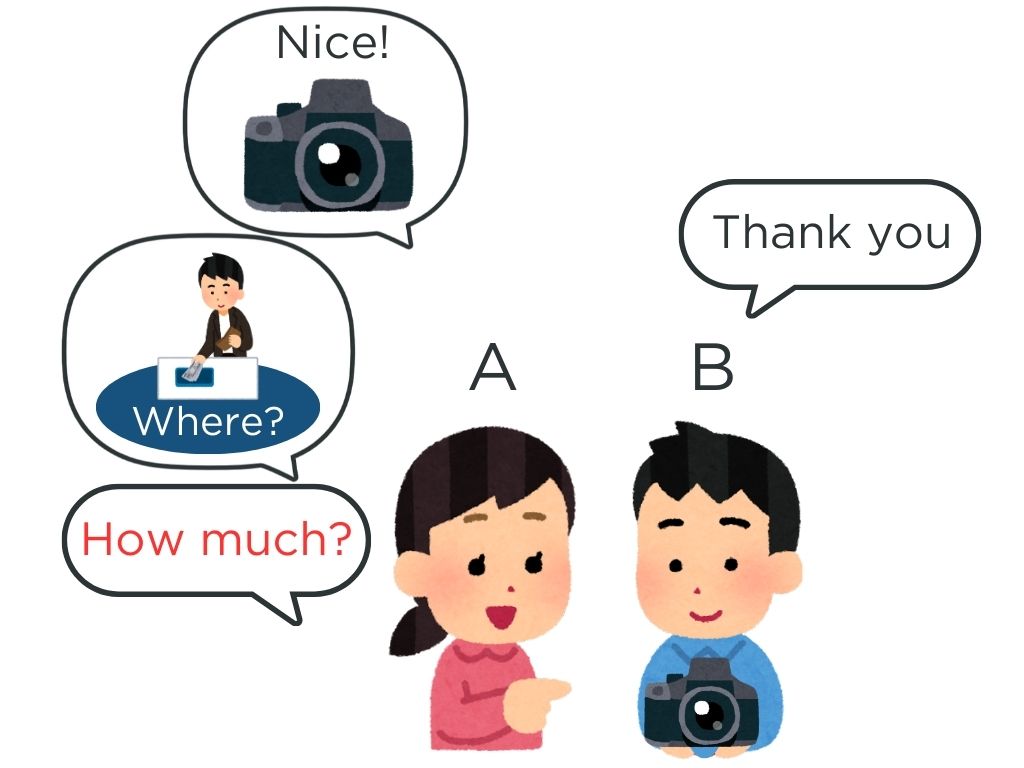 T:どこに行きましたか?、どうやって行きましたか?、何を食べましたか?、何を買いましたか?、いくらでしたか?、何を勉強していますか?