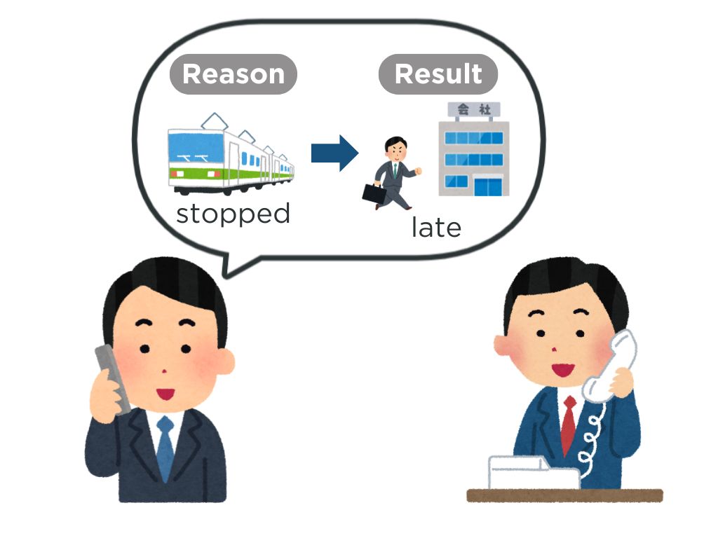 T:会社に遅れます。どうしてですか?電車が止まりました。