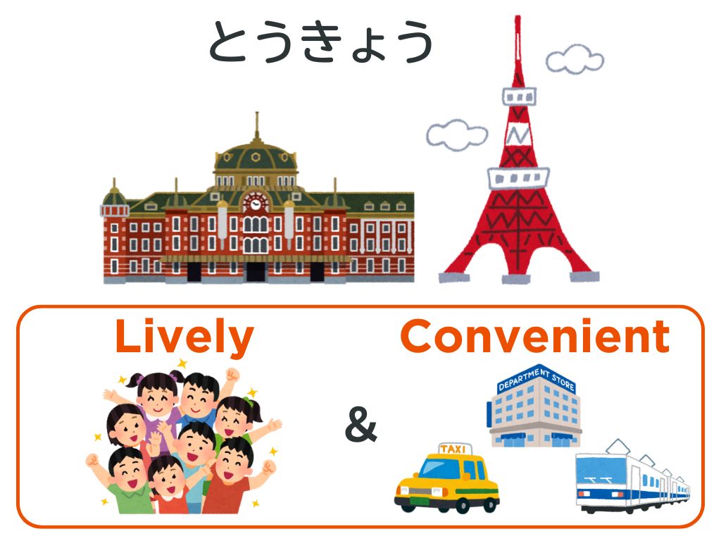 T:有名です+人が多いです、親切です+いいです、簡単です+面白いです、元気です+明るいです、おいしいです+高いです、静かです+みどりが多いです