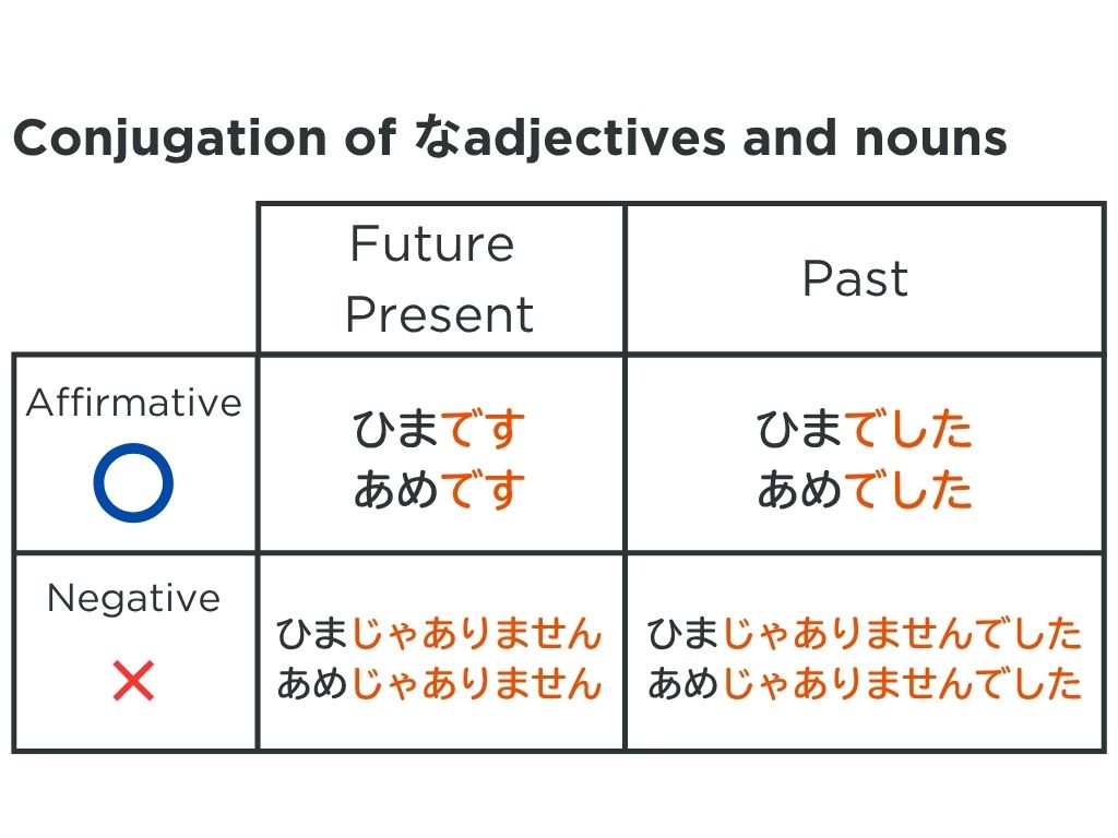 (なA)です、(なA)じゃありません、(なA)でした、(なA)じゃありませんでした。