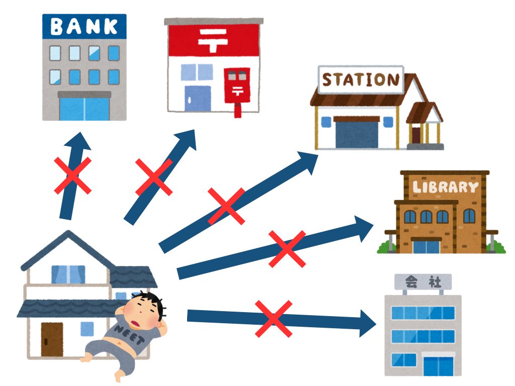銀行に行きません。郵便局に行きません。駅、図書館、会社に行きません。うちです。