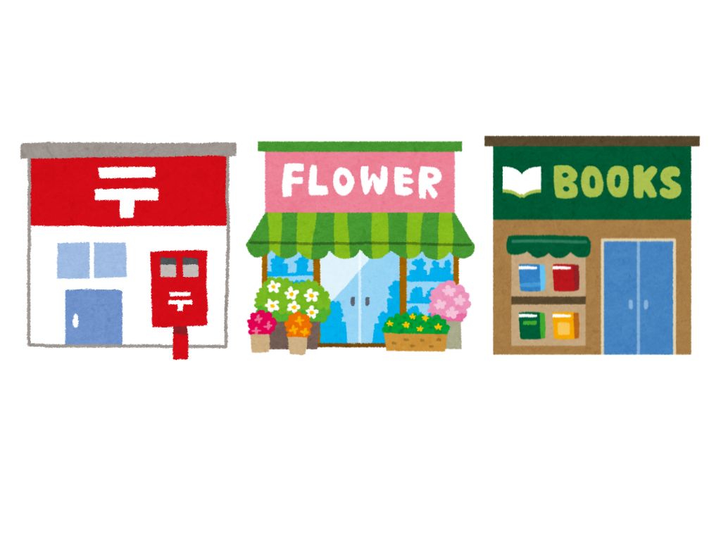 S:郵便局と本屋の間に花屋があります。