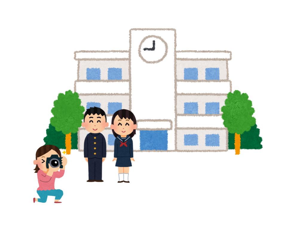 S:学校の前に写真を撮ります。