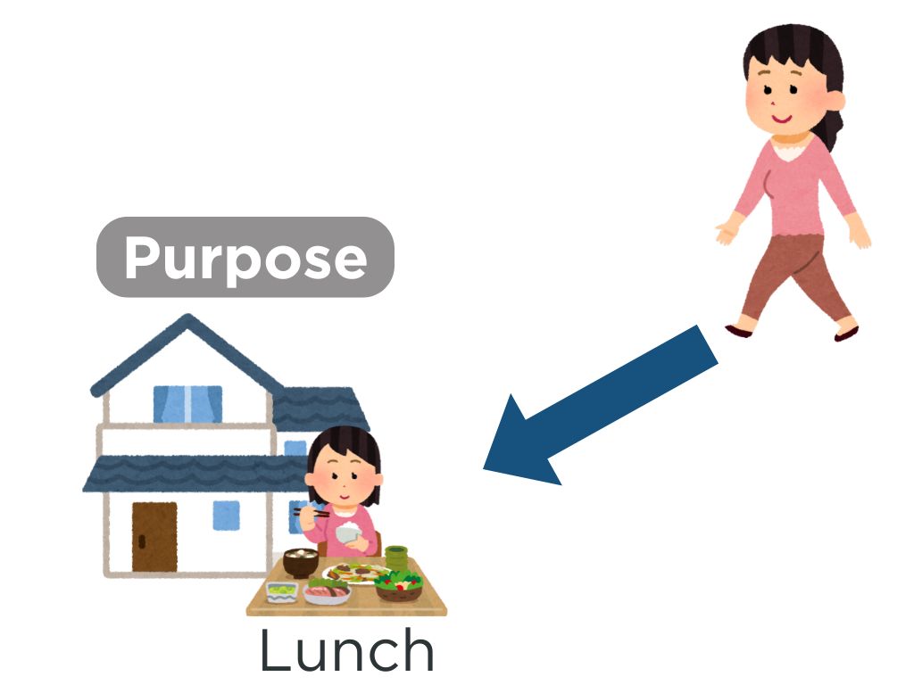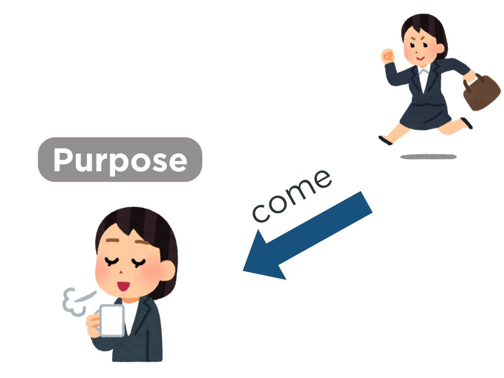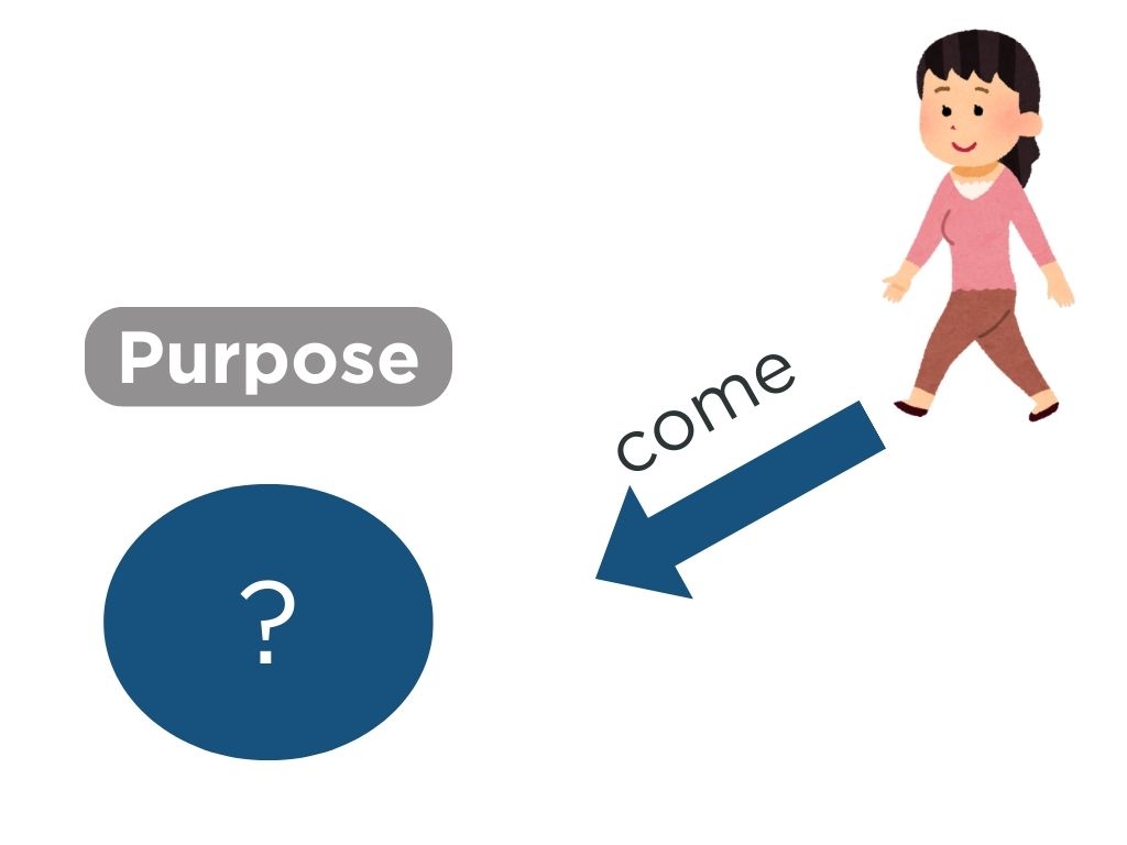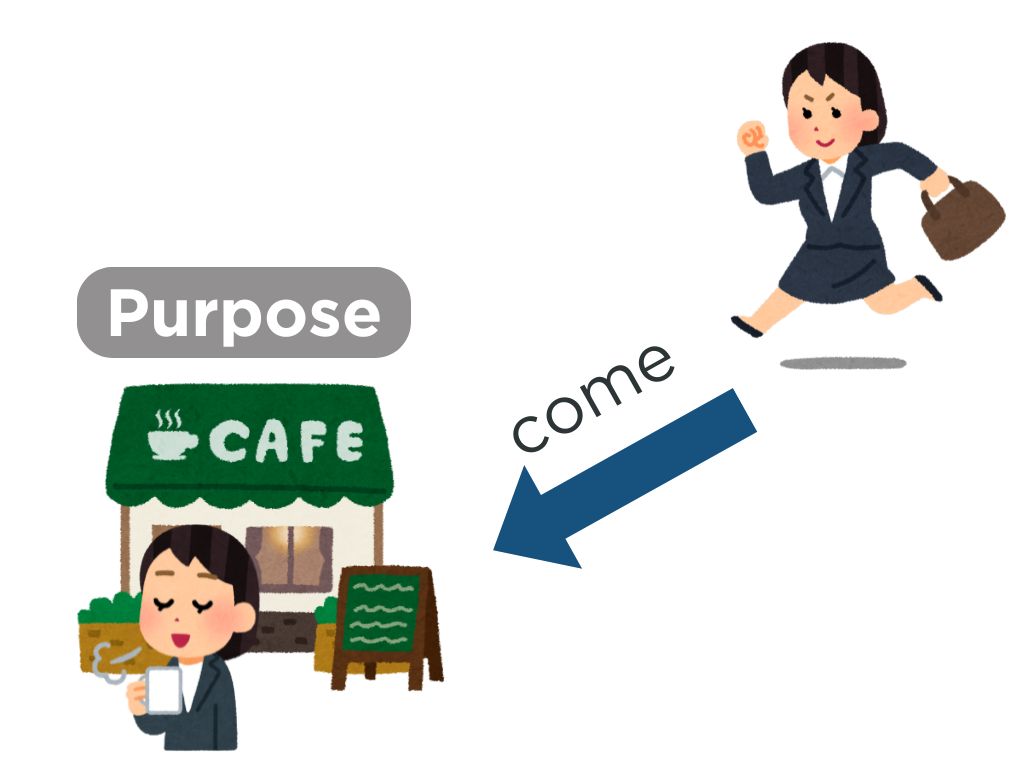 (「行く・来る・帰る」のPCを見せ、目的を指しながら、行動を言う)