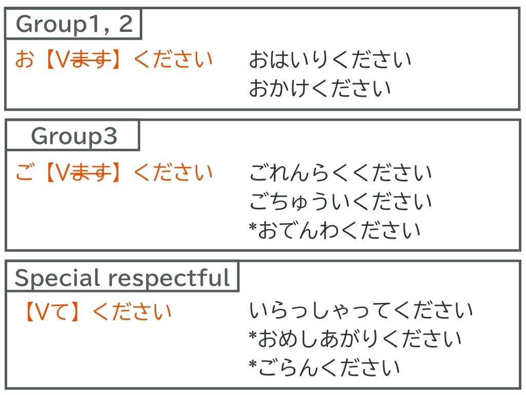 グループ1と2の動詞は「お〜ください」です。