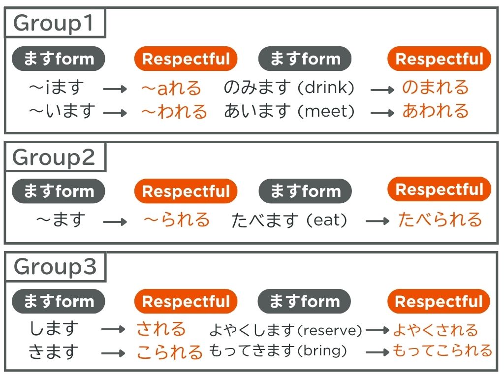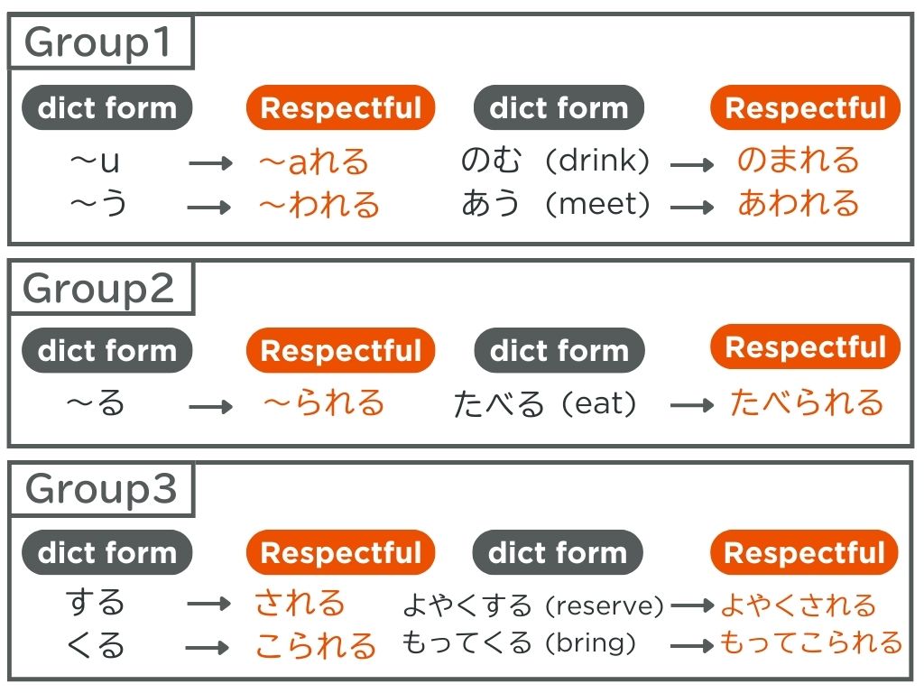 尊敬語は3つ形があります。どれを使ってもいいですが、「特別な形」が一番丁寧です。次に「お〜になります」、最後に「尊敬形」です。