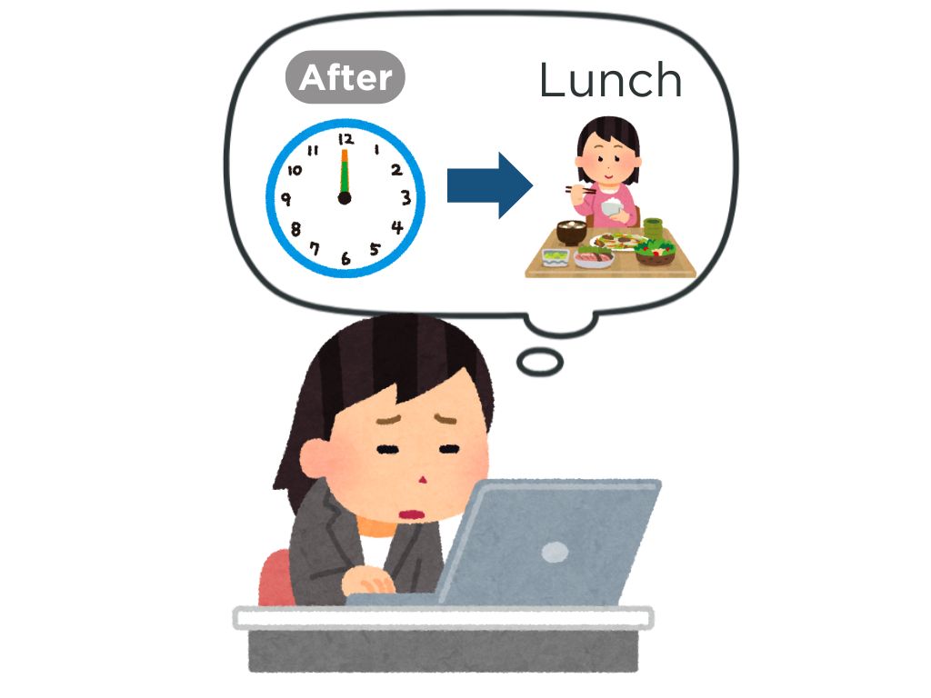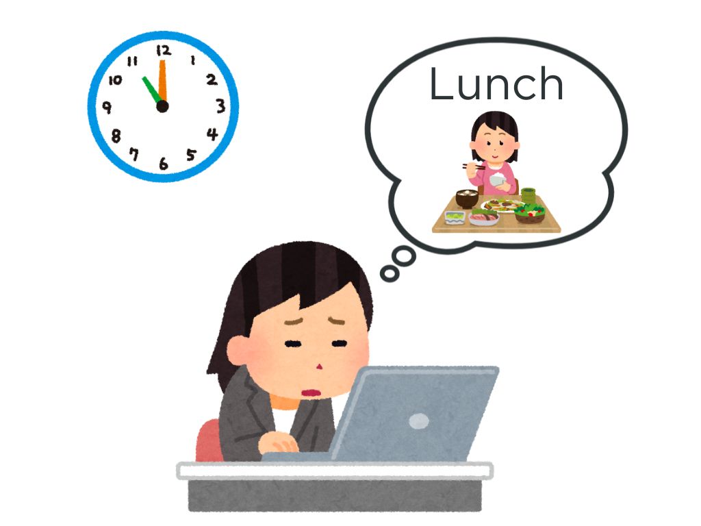 T:私はお腹が空きました。昼ごはんを食べたいですが、昼休みは12時からですから、まだ食べることができません。