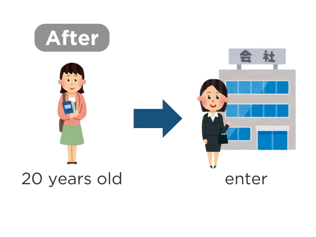 T:9時になる、仕事が終わる、二十歳になる、うちに帰る、会社に着く、シャワーを浴びる、お風呂に入る、会社に入る、大学を出る、歳をとる