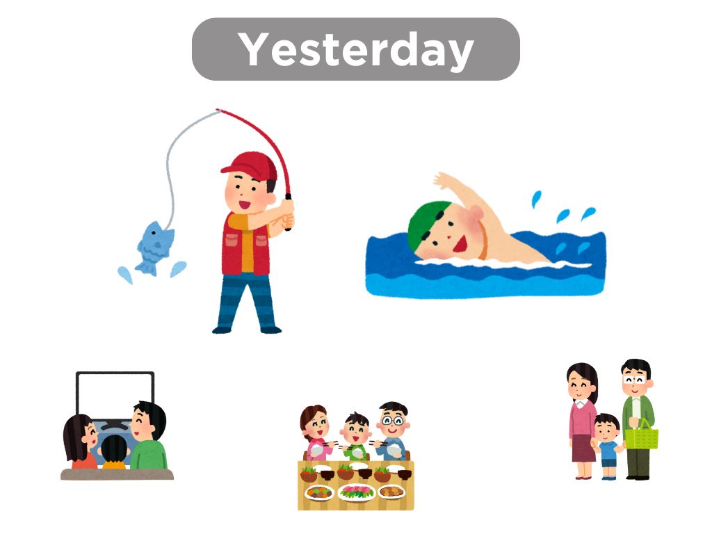 T:本を読みます+音楽を聞きます、釣りをします+山に登ります、掃除しました+洗濯しました、買い物しました+お寺に行きました、ギターを弾きます+歌を歌います、散歩しました+車を洗いました