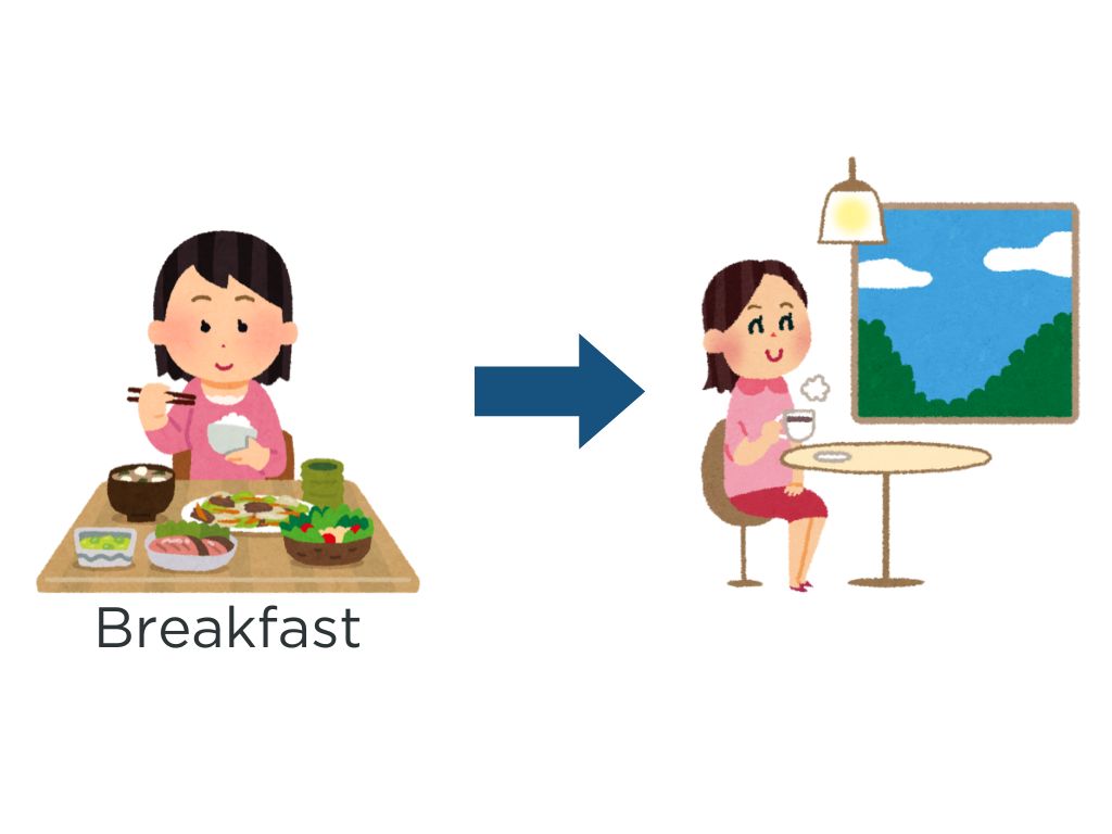 S:朝ご飯を食べて、コーヒーを飲みます。