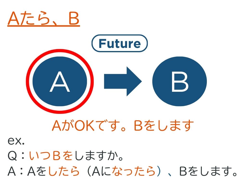 T:「Aたら、B」の意味は「AのconditionがOKです。Bをします」です。