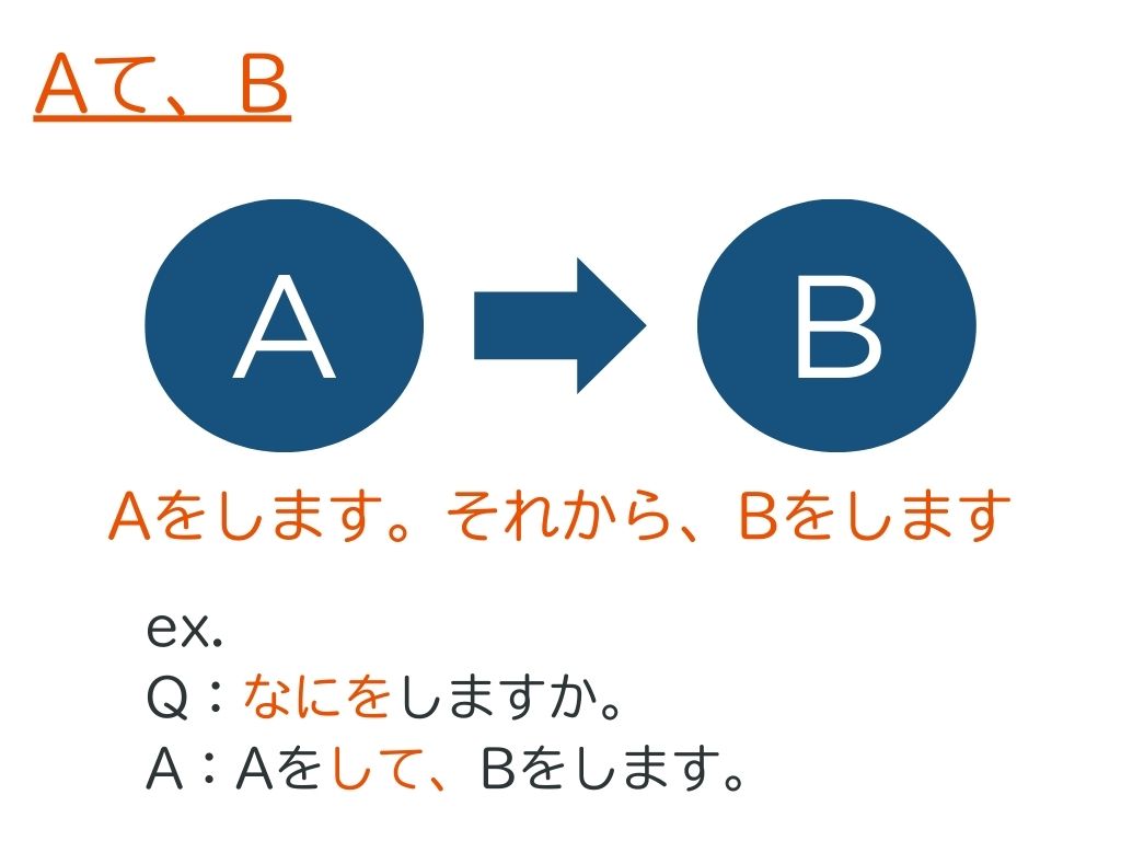 T:「Aて、B」の意味は「Aをします。それから、Bをします」です。