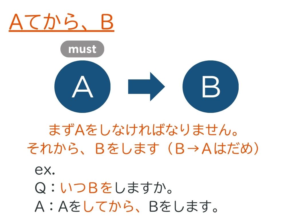 T:「Aてから、B」の意味は「まず、Aをしなければなりません。それから、Bをします」です。「Bをして、Aをします」はだめです。