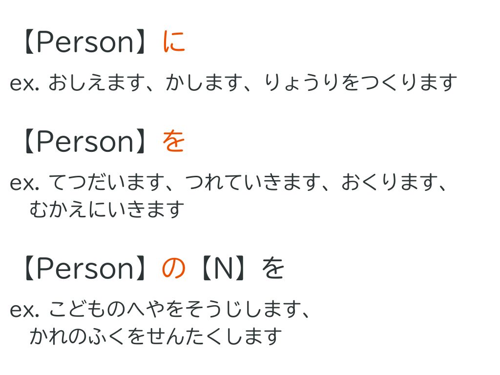 特に「人を手伝います、連れていきます、送ります、迎えに行きます」を覚えてください。