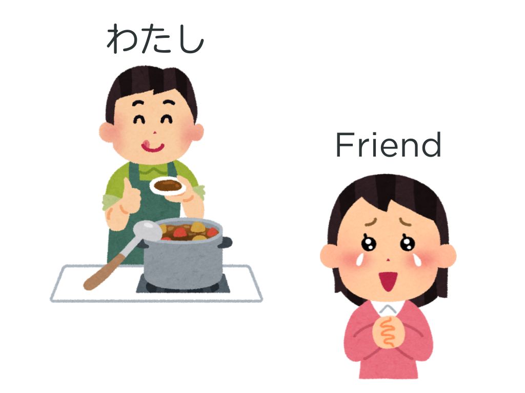 T:私はごはんを作りました。友達はうれしいです。