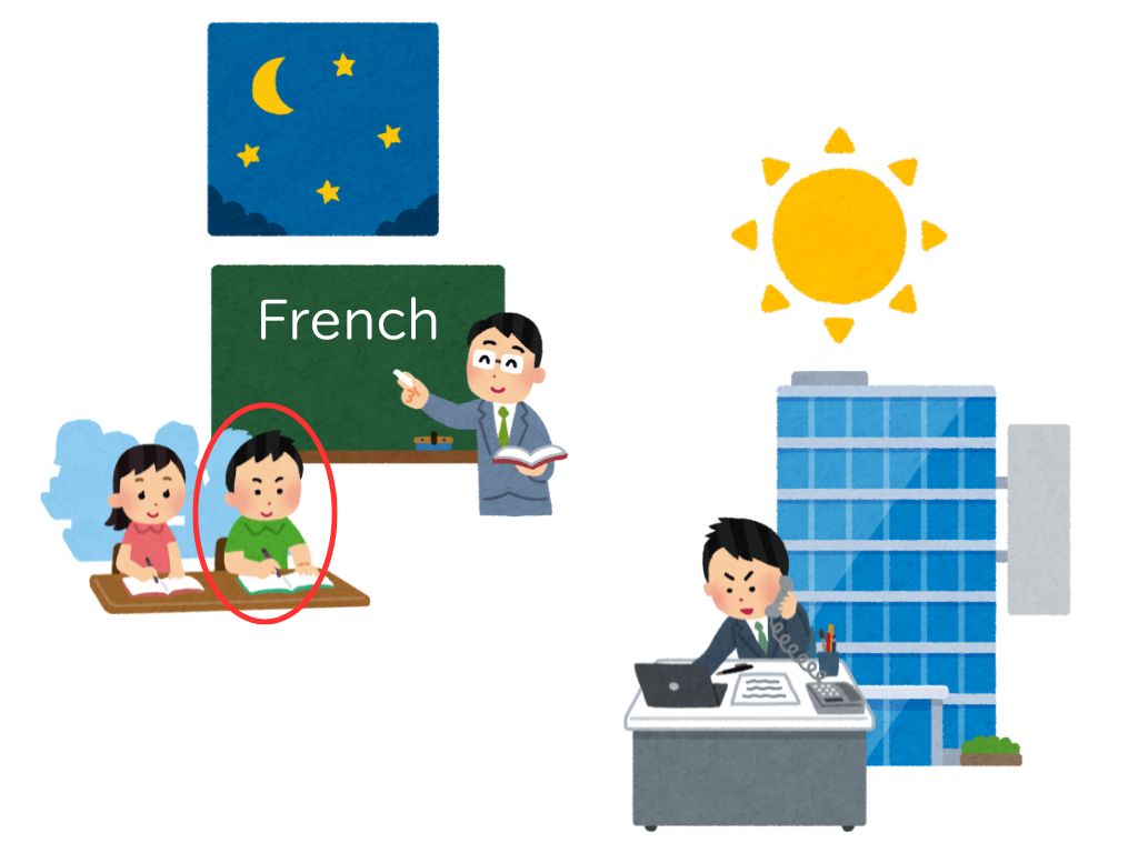 S:夜、フランス語を勉強しながら、昼、会社で働いています。