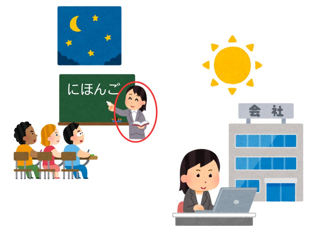 T:この人は夜、学校で日本語を教えています。昼は会社で働いています。
