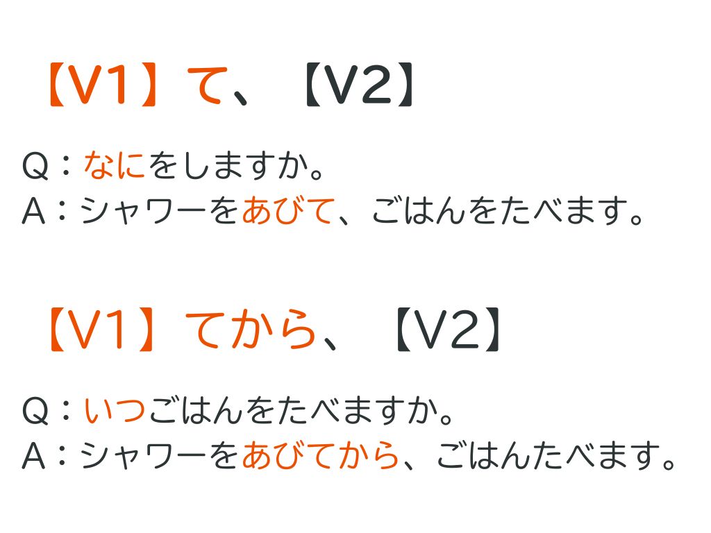 「何をしますか」→「シャワーを浴びて、ご飯を食べます」