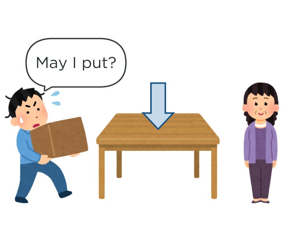 エアコンを消す、窓を開ける、英語で話す、トイレに行く、ここに座る、ここに荷物を置く、辞書を借りる