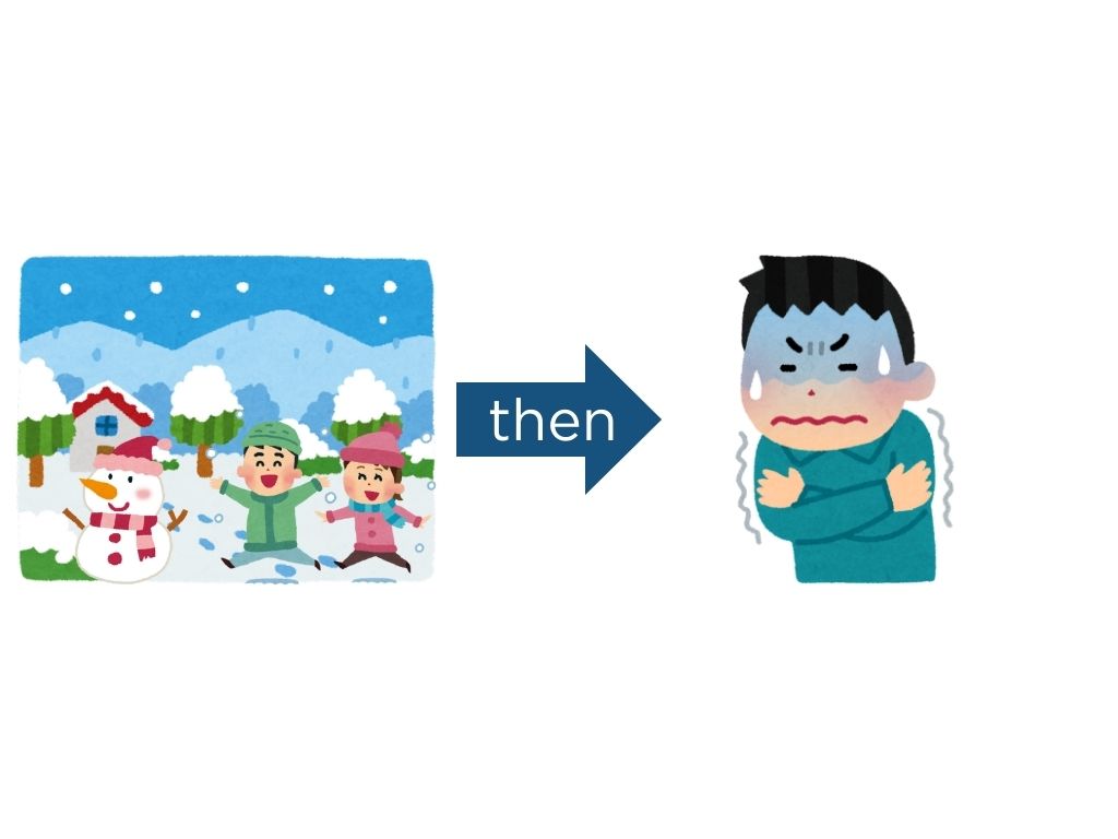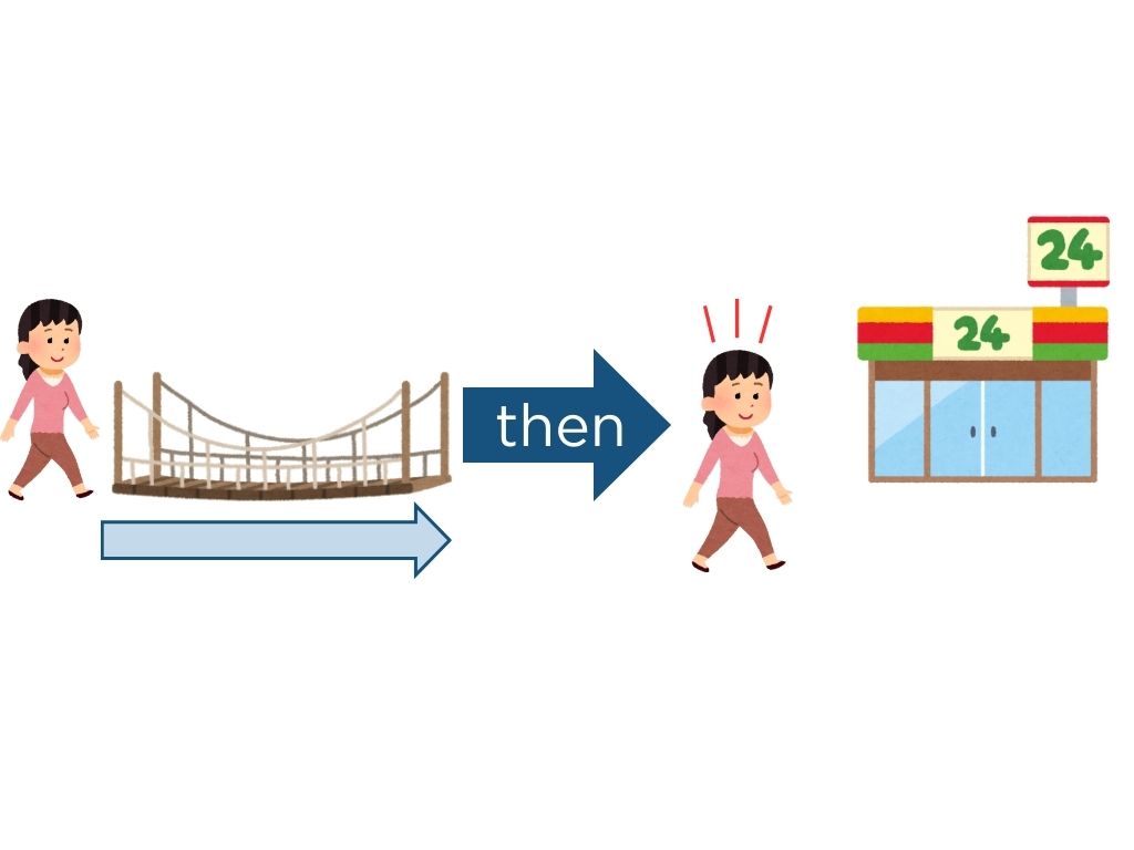 T:橋を渡ります+デパートがあります、ボタンを触ります+部屋が明るくなります、100m歩きます+左にレストランがあります、角を左に曲がります+駐車場があります、冬になります+よく雪が降ります、朝になります+明るくなります、長い時間働きます+疲れます