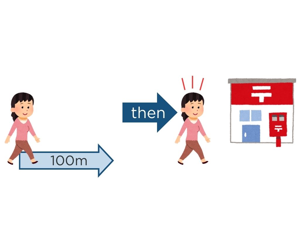 「100メートル歩くと、郵便局を見ます」はだめです。